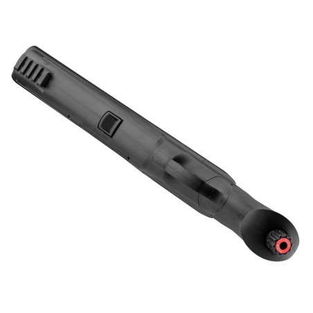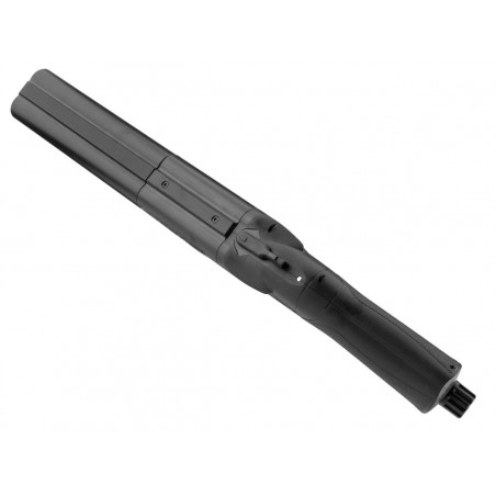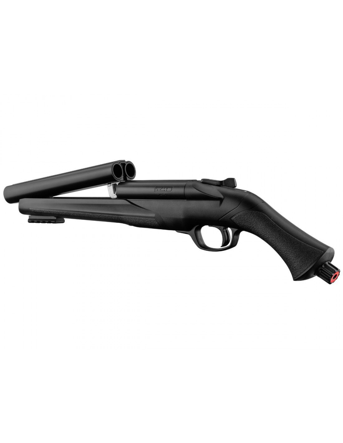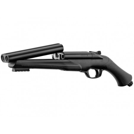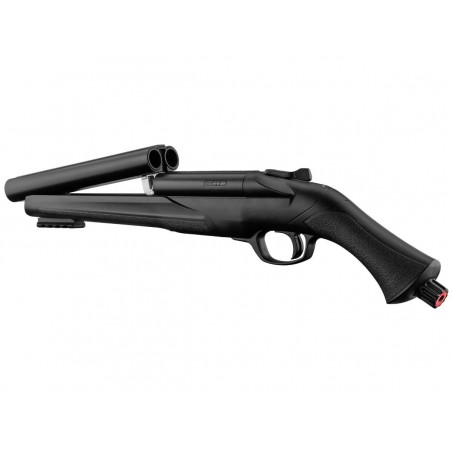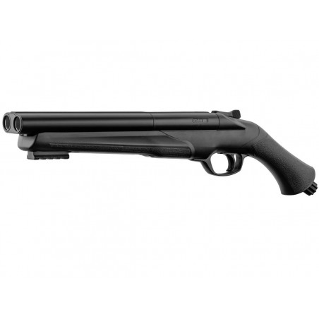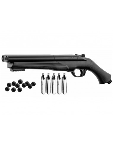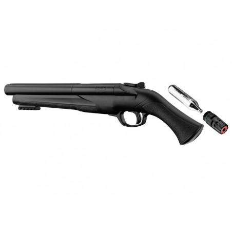 Cette arme d'autodéfense non-létale fonctionne avec une cartouche Co2 qui peut être stockée dans la crosse et percutée qu'au moment de l'utilisation. Son rail Picatinny sous les canons avant permet d'ajouter des accessoires comme une lampe, un laser ou une poignée.
