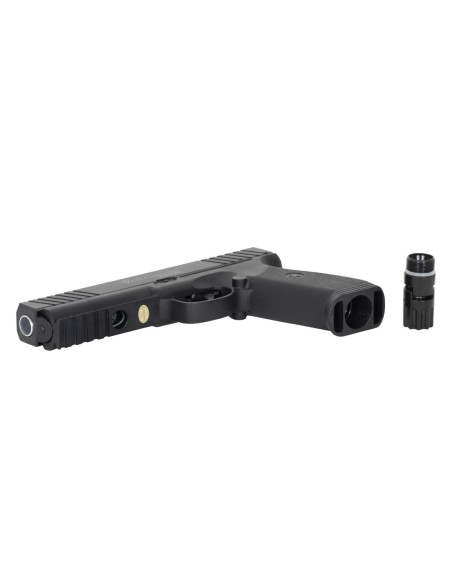 - La cartouche de CO2 s'installe tête vers le bas dans la crosse du pistolet