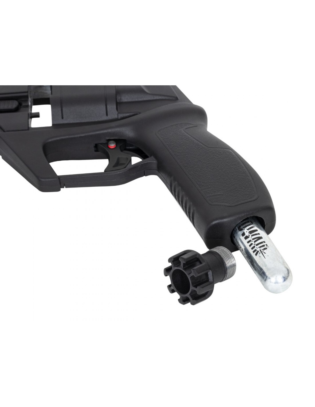 La propulsion à air est obtenue à travers la bouteille standard de CO² de 12 grammes, placée à l’intérieur de la poignée.