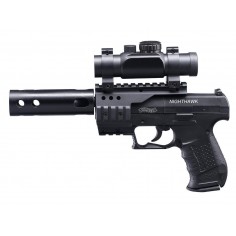 Chambré en Cal .177 (4,5mm), il offre un canon de 8'', un garde-main en nylon fibre, des rails Picatinny, un corps en métal et des organes de visée repliable.