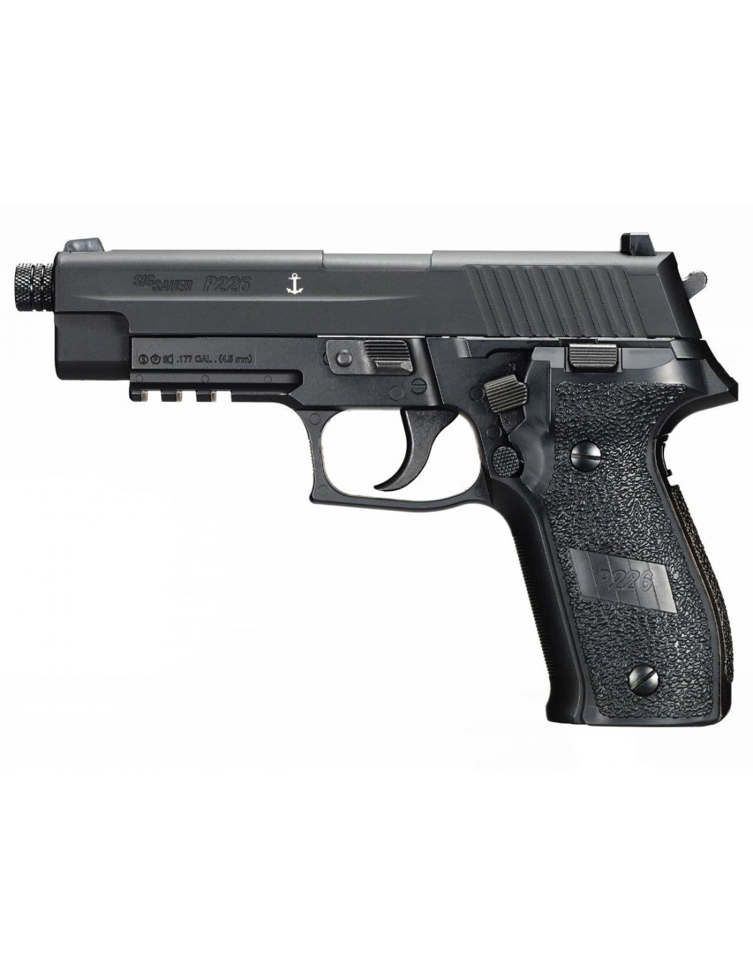 Le P226 Sig Air compatible plombs et billes acier colle au plus près des modèles originaux, en dimensions et poids ! Cartouche CO2 12 g, chargeur rotatif 2x8 coups, rail type Picatinny, canon rayé acier, organes de visée fixes, carcasse et culasse mobile en métal.