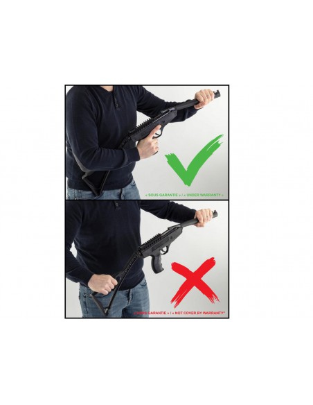 Attention, ne pas armer le pistolet en s'appuyant sur la crosse, sous peine de non prise en garantie si casse.