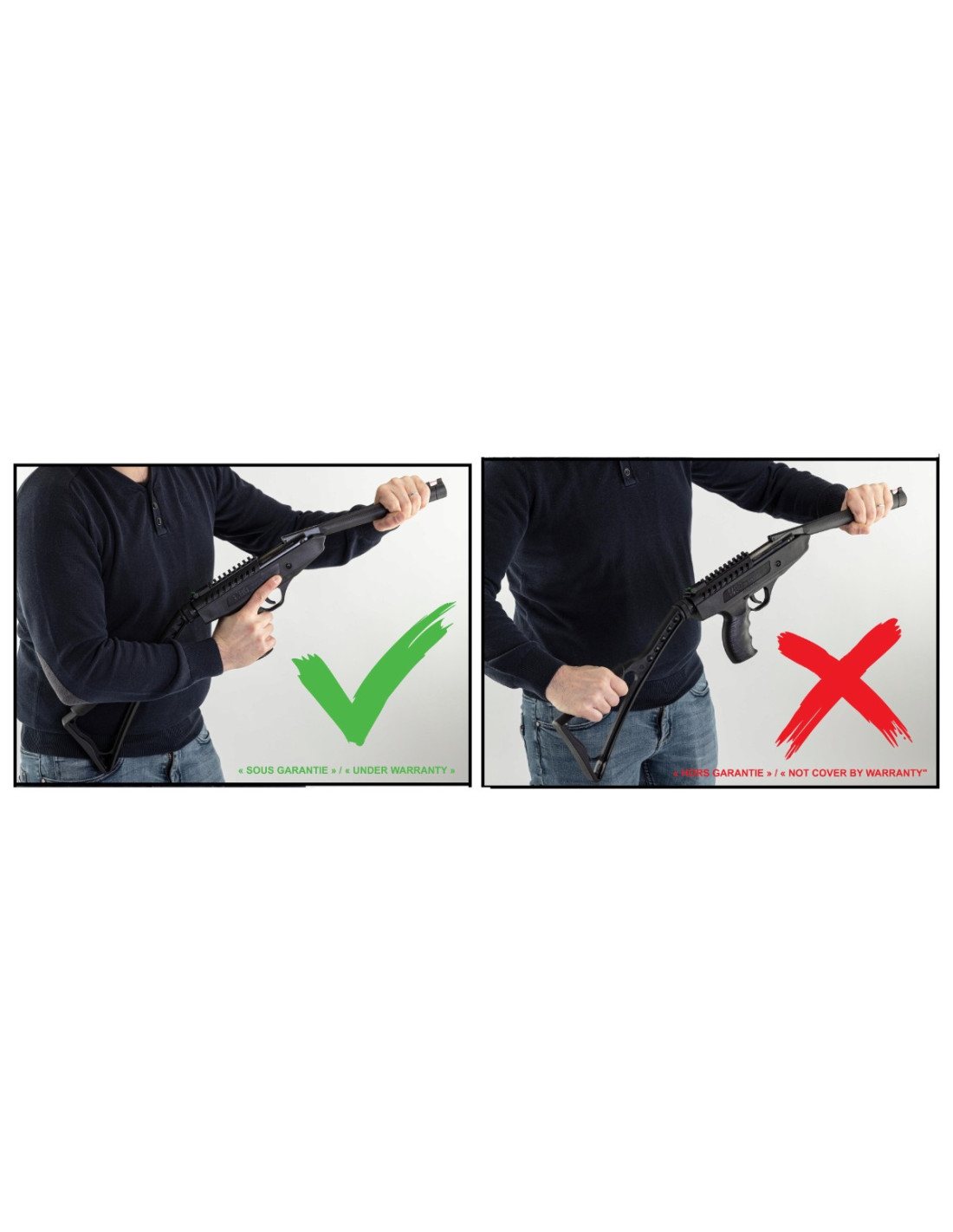 Attention, ne pas armer le pistolet en s'appuyant sur la crosse, sous peine de non prise en garantie si casse.
