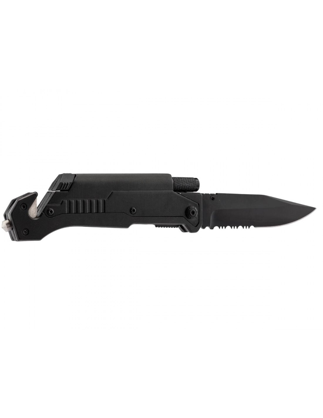 Liner lock. Manche avec coupe-ceinture, lampe led, allume-feu, pointe brise vitre et clip.