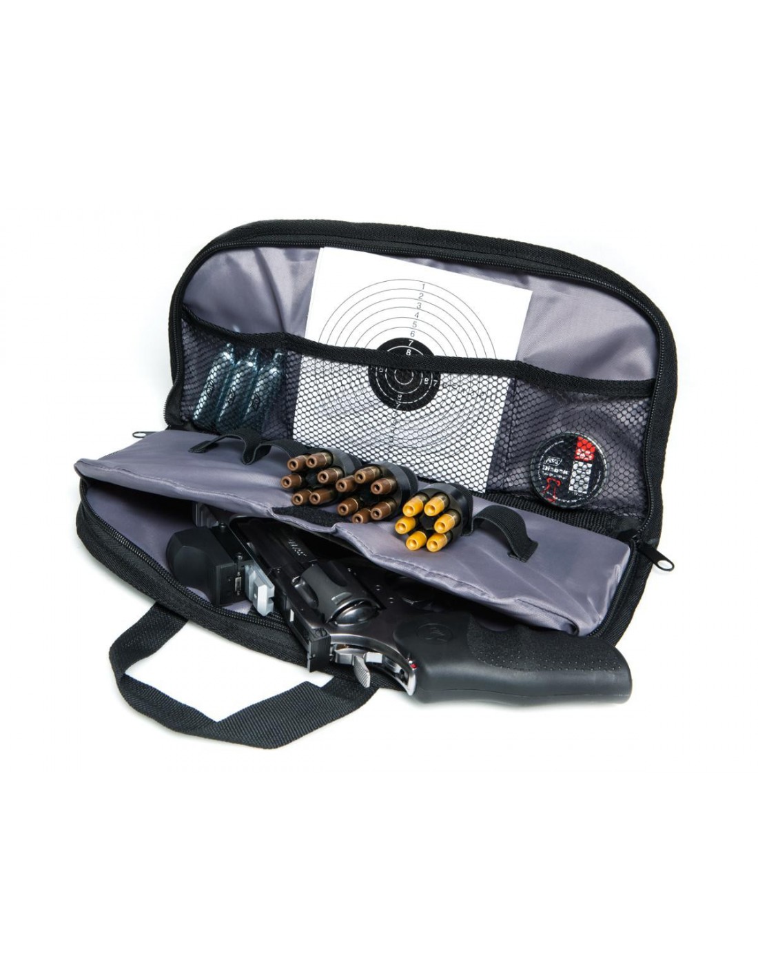 C'est un sac étonnamment spacieux avec un compartiment séparé rembourré avec fermeture velcro pour le stockage de l'arme de poing et des boucles élastiques pour maintenir les chargeurs avec les speedloaders.